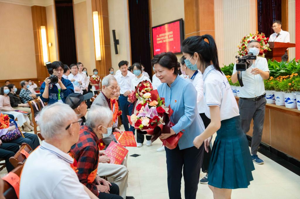 校长郝芳华携全体校领导给90岁寿星代表献花