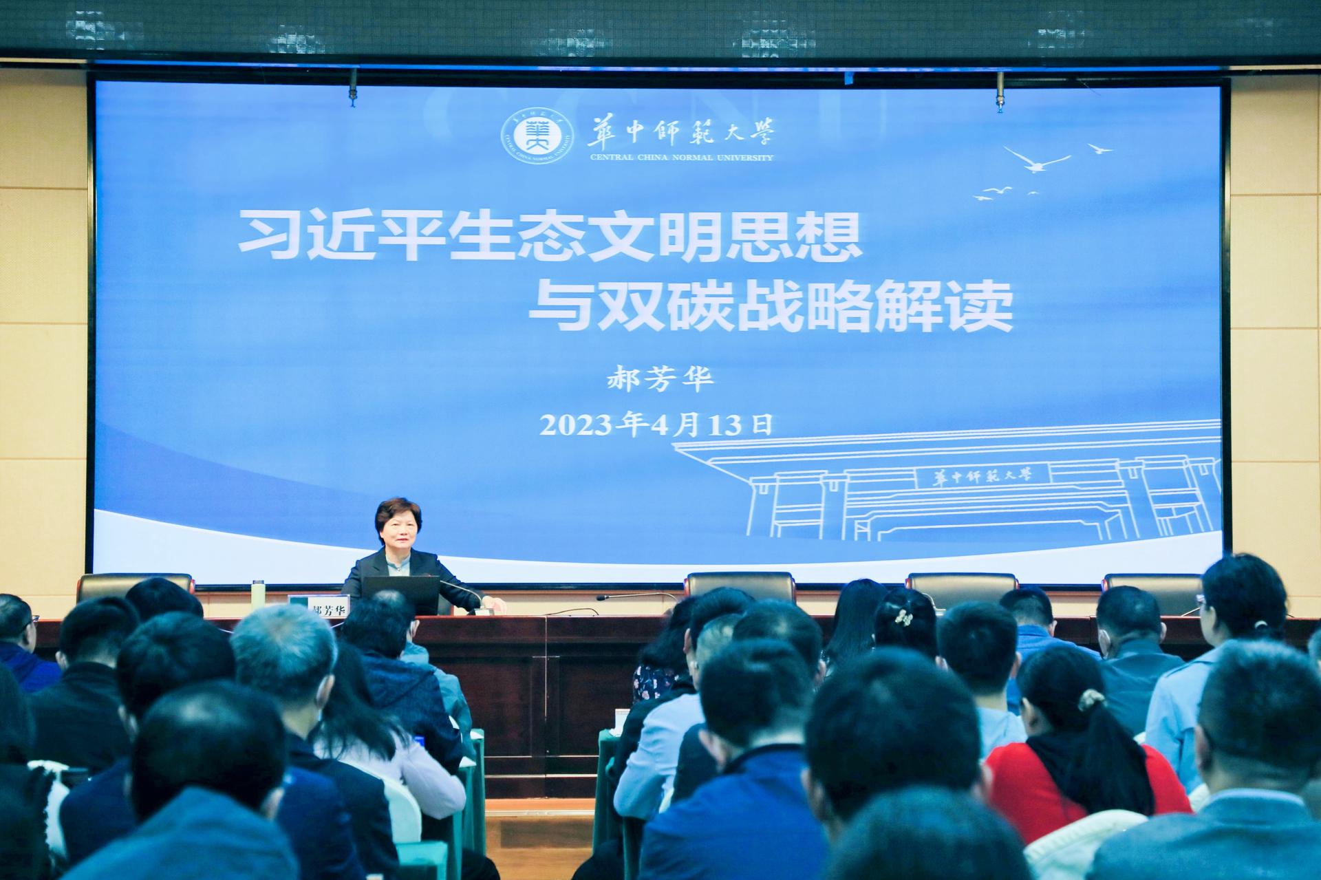 华大在线讯(通讯员 张黎)4月13日,校长郝芳华教授来到管理教育综合楼,为79期中南班和91期省直班的干训学员作《习近平生态文明思想与双碳战略解读》专题报告。