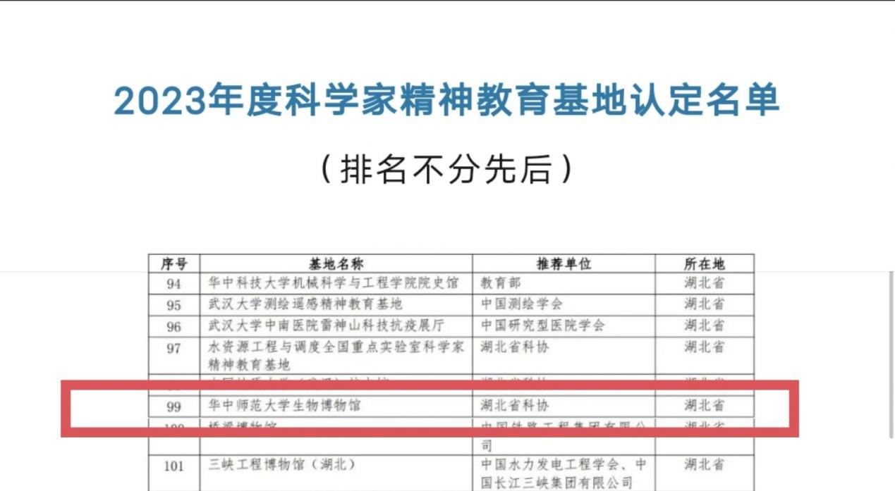 华大在线讯(通讯员 邓淑文 黄悦)5月30日,中国科协、教育部、科技部、国务院国资委、中国科学院、中国工程院、国防科工局联合发布2023年度科学家精神教育基地认定名单。经过初评、终评和公示等程序,【星空】官网生物博物馆成功入选2023年度科学家精神教育基地。