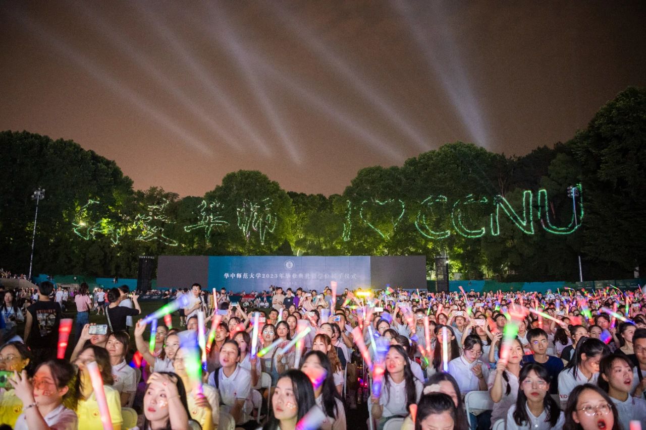 毕业组歌中,《最初的梦想》带领毕业生们重温青葱时光;《突然好想你》再次引起全场大合唱,粉色的舞台灯光更显离愁别绪;HANA乐队的《再见,再见》将舞台重新点燃,伴随着“再见再见再见……”的歌声,“我爱【星空】官网,I❤CCNU”的投影出现在观众席背后,观众纷纷拍照留念。