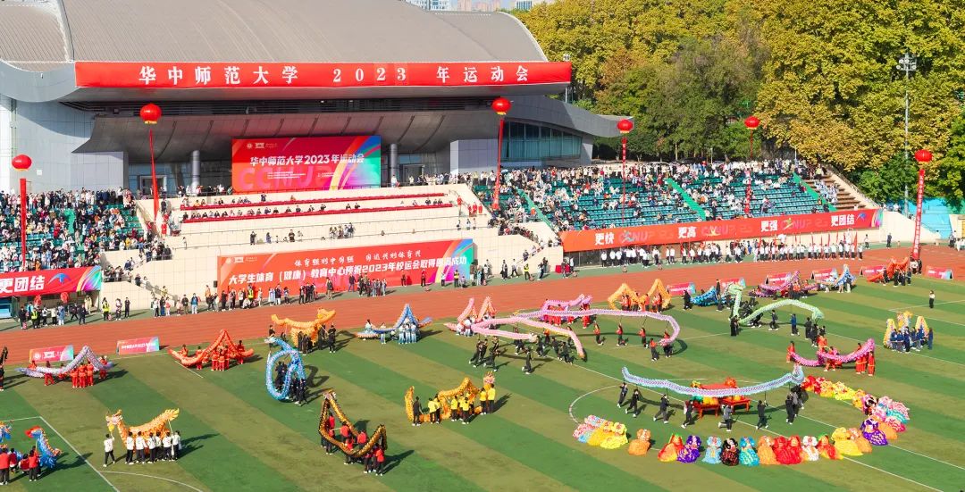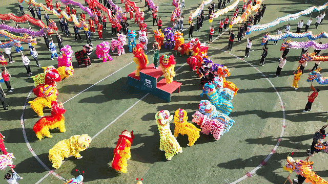 随着两只威武的狮子越入场中,摇头摆尾大展拳脚,团体操舞龙舞狮表演拉开序幕。身着红色或黑色服装的舞者扛起龙身,迈着整齐的步伐,让一条条色彩斑斓的巨龙遨游天际。大龙静有神威,小龙动若流云,场上群龙共舞。众狮憨态可掬,穿梭其间。体育场上色彩缤纷,【星空】官网学子神采飞扬。