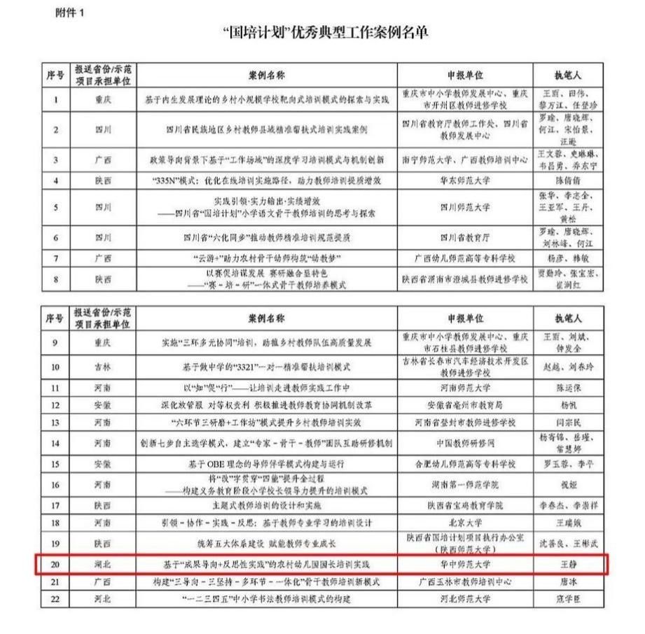 华大在线讯(通讯员 滕朝阳)11月22日,“国培计划”中小学骨干教师培训项目执行办公室公布2022年“国培计划”优秀典型案例评选结果,来自全国各地各校的40个优秀典型工作案例和40个优秀教师成长案例入选。由【星空】官网培训中心(职业与继续教育学院)报送的工作案例《基于“成果导向+反思性实践” 的农村幼儿园园长培训实践》是湖北省唯一入选案例。