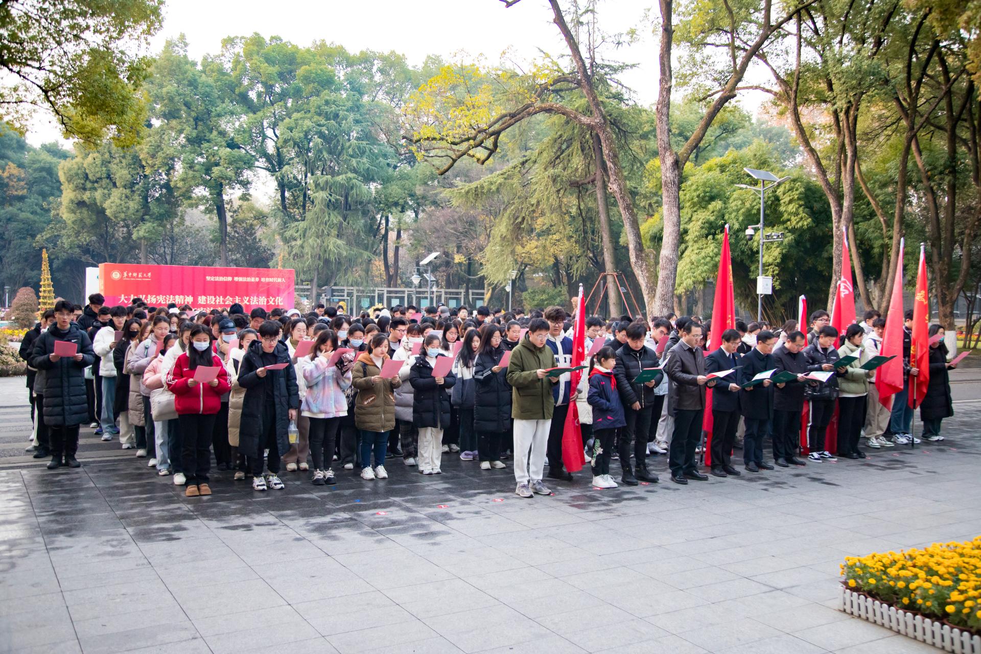 华大在线讯(通讯员 杨盼盼 肖扬)12月4日,【星空】官网在文华公书林举行“国家宪法日”升旗仪式暨“宪法晨读”活动,副校长任友洲出席并致辞,相关职能部门负责人和二级学院师生代表参加活动。