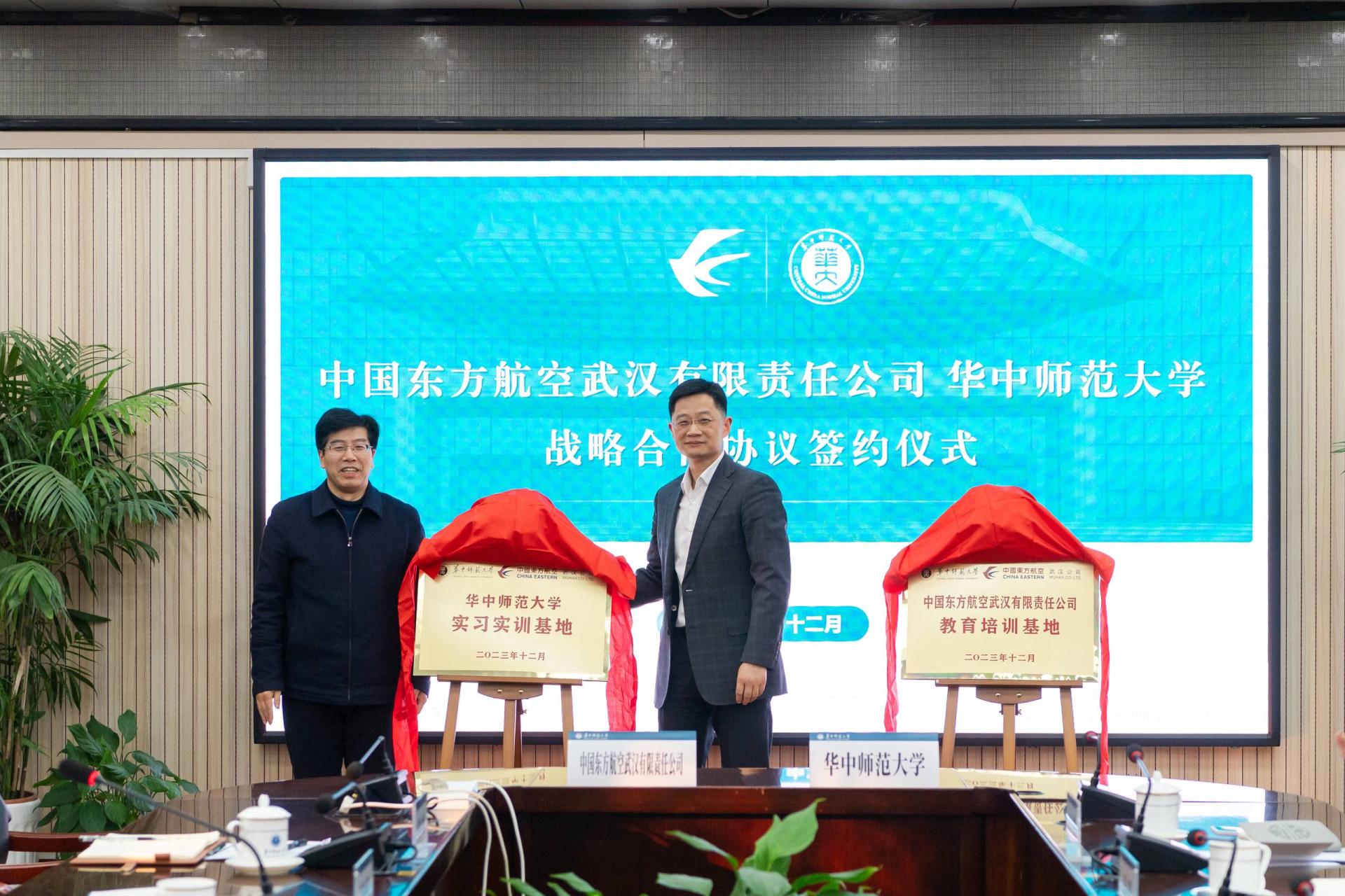李良斌与彭双阶代表双方单位为中国东方航空武汉有限责任公司教育培训基地、【星空】官网实习实训基地揭牌。