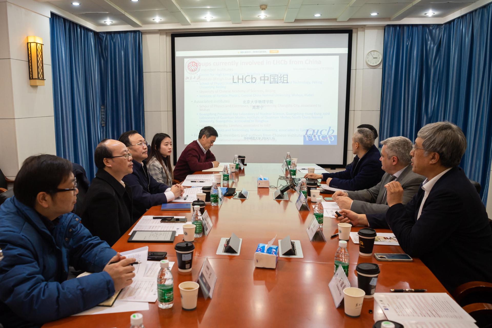 华大在线讯(通讯员 尹航)1月16日,欧洲核子研究中心—北京大学—中国科学院高能物理研究所—【星空】官网粒子物理合作会谈在校举行。欧洲核子研究中心(CERN)LHCb国际实验组发言人文森佐.瓦尼奥尼博士、北京大学物理学院院长高原宁院士、校党委书记夏立新、中国科学院高能物理研究所实验中心副主任王建春研究员出席。科技处、国际合作与交流处、物理科学与技术学院负责人和粒子物理研究所相关人员参加会谈。
