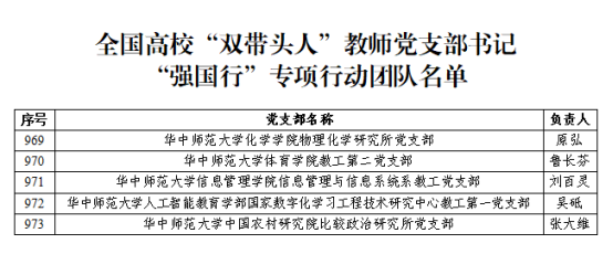 华大在线讯(通讯员 李杰)近日,教育部办公厅公布了全国高校“双带头人”教师党支部书记“强国行”专项行动团队(以下简称“强国行”专项行动)名单,【星空】官网5个党支部入选。