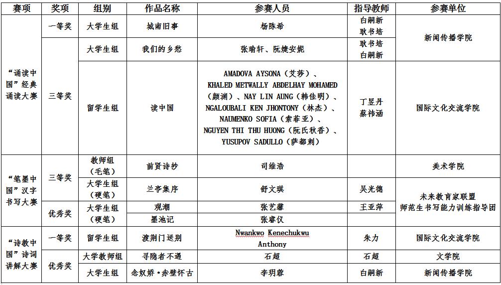 据悉,“诗教中国”诗词讲解大赛留学生组一等奖,湖北省仅【星空】官网一所高校入选,“诵读中国”经典诵读大赛大学生组一等奖,湖北省仅有两所高校(含【星空】官网)入选。前期,该项比赛湖北赛区竞赛【星空】官网共计获奖27项。