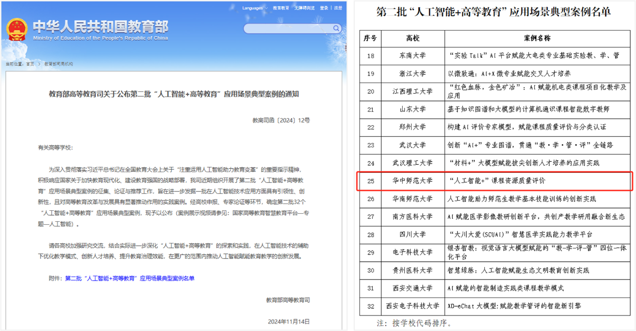 2024年6月,为深入贯彻落实习近平总书记在全国教育大会上关于“注重运用人工智能助力教育变革”的重要指示精神,积极响应国家关于加快教育现代化、建设教育强国的战略部署,教育部高等教育司组织开展了第二批“人工智能+高等教育”典型应用场景案例的征集和论证工作,发掘在人工智能技术应用方面具有引领性、创新性,且对高等教育改革与发展具有显著推动作用的实践案例。自此次案例征集启动以来,【星空】官网积极响应,信息化办公室迅速开展校内遴选工作,并推选优秀案例参加。经过教育部专家论证,最终确定第二批 “人工智能+高等教育”应用场景典型案例名单。