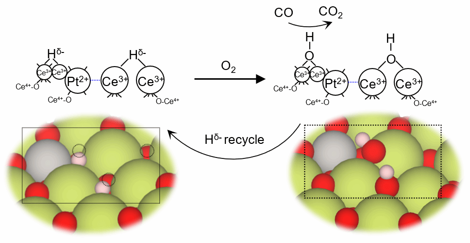 图2为Pt2+-Ce3+Hδ-氢化活性位点示意图及Hδ-介导的高效催化机制