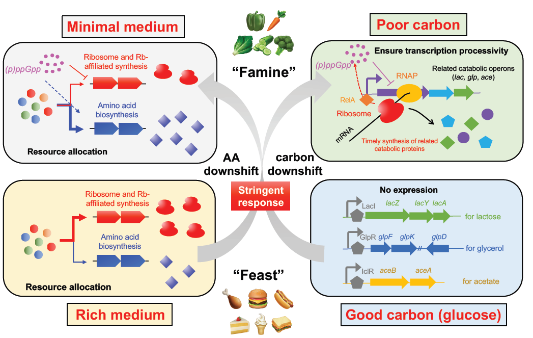 定量蛋白质组学研究表明,上调鸟苷四磷酸可以使得细菌全局蛋白质组资源配置从核糖体合成转向氨基酸生物合成,进而促进细菌对氨基酸营养下调的生长适应,解释了relA缺陷型菌株为何较野生型菌株需要更长的延滞期。另一方面,在碳源下调情况下,relA 缺陷型菌株由于缺乏鸟苷四磷酸严谨反应,导致转录-翻译发生解偶联,从而损害了转录延伸的持续性进而抑制了相关分解代谢操纵子的及时表达。总体来说,鸟苷四磷酸在细菌细胞生长中的调控作用类似于一枚硬币的正反面:一方面它是细菌全局生长的抑制因子;另一方面它却是推动细菌生长适应营养下调的促进因子。这项研究阐明了细菌在营养波动环境下保持适种群合度的重要策略。