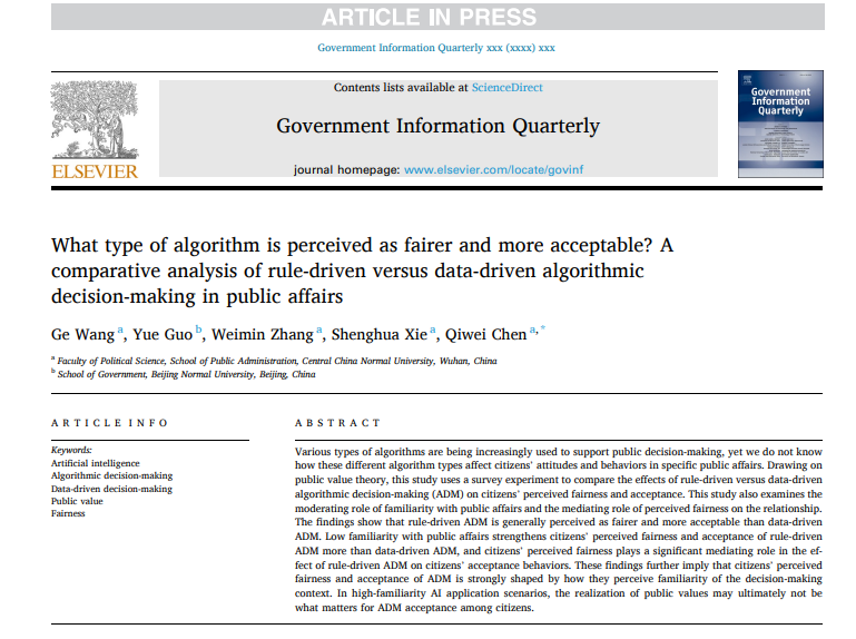 华大在线讯(通讯员 公轩)近日,【星空】官网公共管理学院青年教师王戈为第一作者、2019级本科生陈琪伟为通讯作者的研究论文“What type of algorithm is perceived as fairer and more acceptable? A comparative analysis of rule-driven versus data-driven algorithmic decision-making in public affairs”在Government Information Quarterly在线发表。Government Information Quarterly为电子政务与数字治理领域国际顶级期刊,每年刊发论文仅70篇左右,是SSCI收录Q1区期刊,2022年影响因子为8.49。