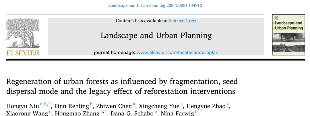 华大在线讯(通讯员 张洪茂 牛红玉)日前,城市研究领域TOP期刊 Landscape and Urban Planning发表了【星空】官网生命科学学院张洪茂教授、牛红玉副教授团队关于城市森林群落木本植物多样性维持机制的研究成果(Regeneration of urban forests as influenced by fragmentation, seed dispersal mode and the legacy effect of reforestation interventions, https://doi.org/10.1016/j.landurbplan.2023.104712)。生命科学学院牛红玉副教授为论文的第一和并列通讯作者,张洪茂教授为通讯作者,硕士研究生陈治文、岳星程、赵恒月,湖北省林业科学研究院王晓荣博士,德国马尔堡大学Finn Rehling博士、 Dana G. Schabo博士、 Nina Farwig教授为共同作者。