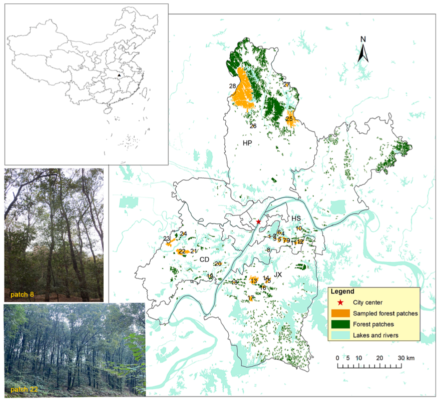 图1:研究的28个森林斑块的地理位置和典型斑块森林外貌
