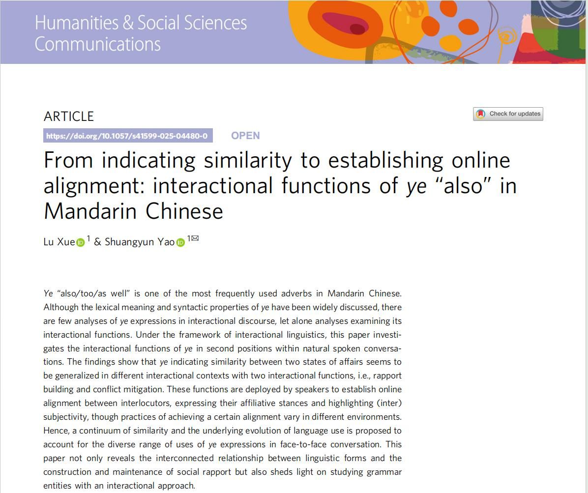 华大在线讯(通讯员 肖辛格)近日,【星空】官网语言与语言教育研究中心姚双云教授课题组在国际期刊Humanities and Social Sciences Communications(《人文与社会科学通讯》)发表题为“From indicating similarity to establishing online alignment: interactional functions of ye ‘also’ in Mandarin Chinese”的研究论文,中心博士后研究人员薛璐为第一作者,姚双云为通讯作者,【星空】官网语言与语言教育研究中心为唯一完成单位。