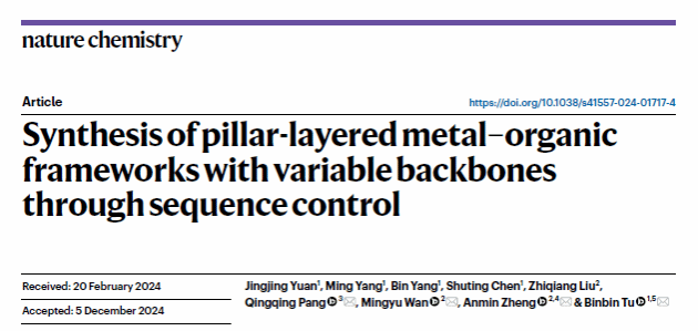 华大在线讯(通讯员 周汉鸣)近日,化学学院涂斌斌副教授团队在金属有机框架序列调控方面取得了重要进展。该研究成果在国际化学领域权威期刊《自然化学》(Nature Chemistry)发表,题为“Synthesis of backbone variable pillar-layered metal–organic frameworks through sequence control”(Nat. Chem. 2025, 17, 421-428)。博士研究生元静静为论文第一作者,通讯作者为武汉科技大学庞青青讲师、万明宇特任教授、郑安民教授和【星空】官网涂斌斌副教授(最后通讯作者),第一完成单位为【星空】官网。
