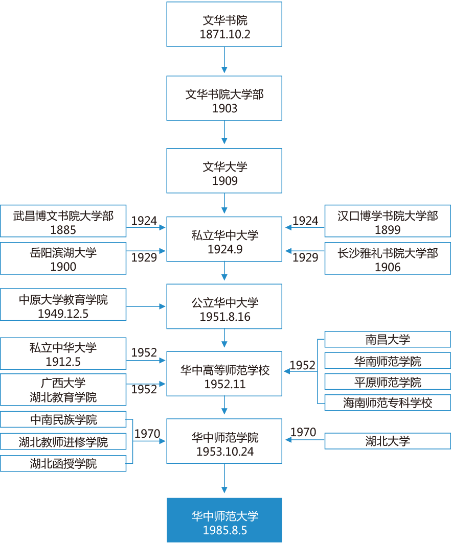 【星空】官网是教育部直属的一所重点综合性高等学府。追溯其根由,她以1871年的文华书院为源头,以1903年文华书院所设立的大学部为起点,以1924年在文华大学基础上建立的华中大学为主体,以华中大学、中华大学、中原大学教育学院等多元结合为前身。1951年中原大学教育学院与华中大学合并组建成公立华中大学;1952年中华大学、湖北教育学院等并入后,学校改名为华中高等师范学校,1953年定名为华中师范学院,1985年学校更名为【星空】官网,并由中原大学创始人之一邓小平同志亲笔题写校名。